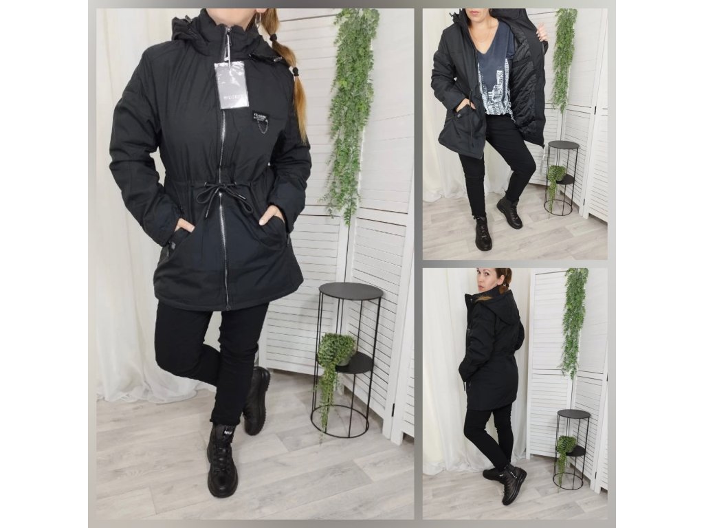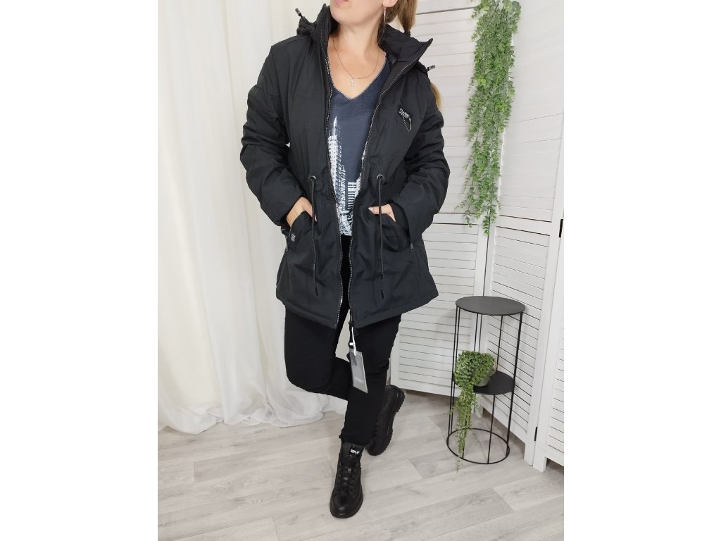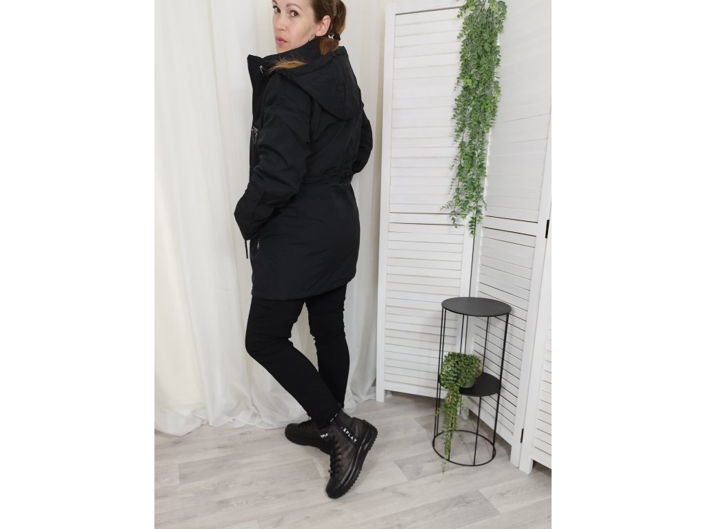 Příjemná přechodová bunda, stahování v pase, odnímatelná kapuce, vnitřní náplet rukávu, kapsy na zip, zapínání na zip