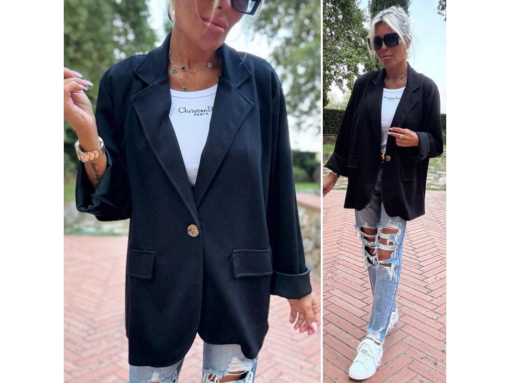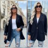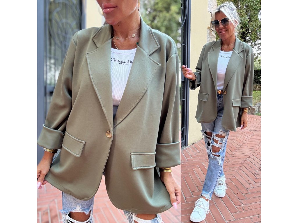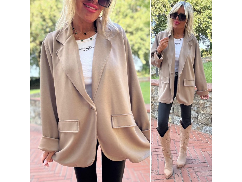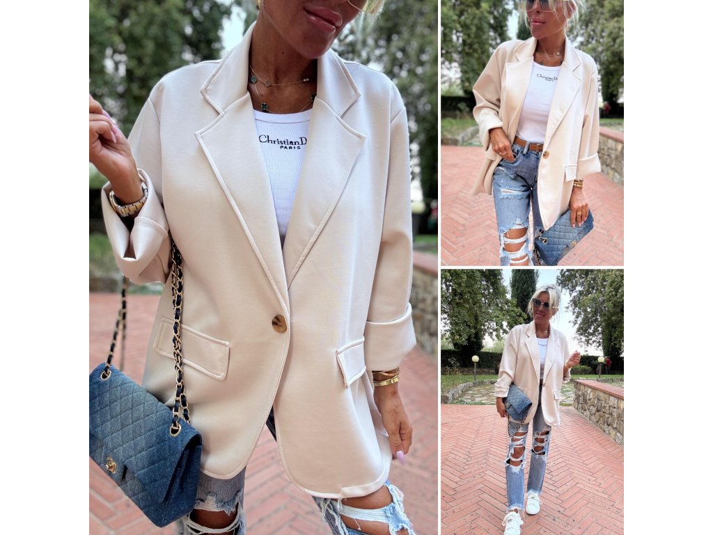 elastické sako, zapínání na jeden knoflík, máselkový materiál, falešné kapsy