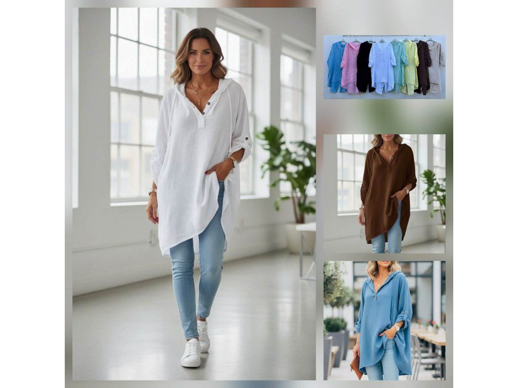 Design doplňuje praktická kapuce, knoflíčky u výstřihu a rukávy s možností ohrnutí, které si snadno přizpůsobíte podle potřeby.